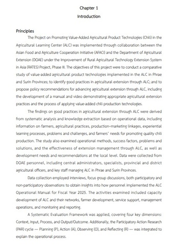 This document highlights a Training of Trainers (TOT) program held from February 27 to April... The Project on Promoting Value-Added Agricultural Product Technologies (Chili) in the Agricultural Learning Center (ALC)